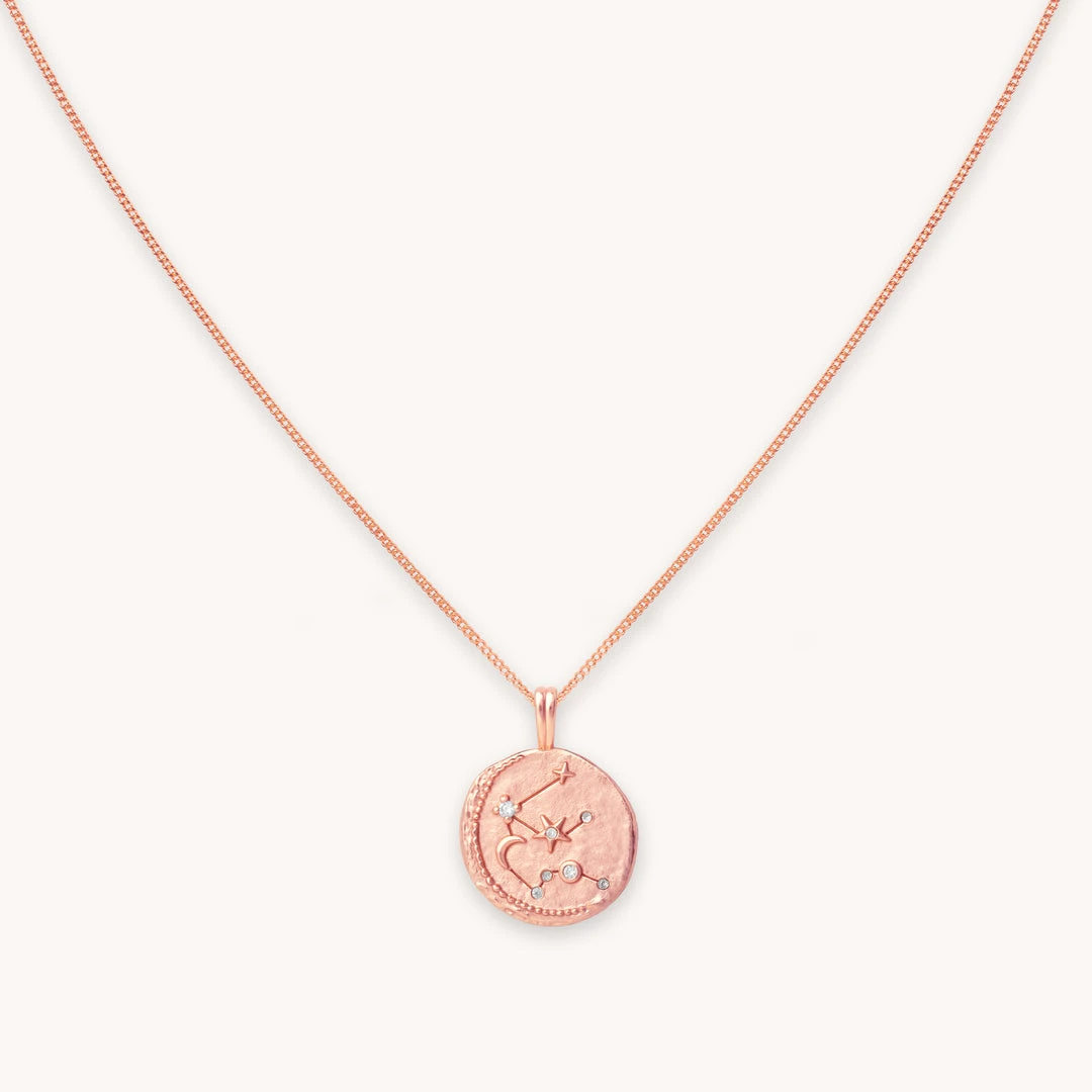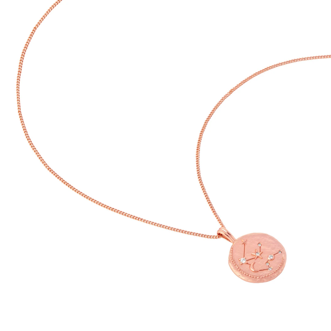 The Zodiac Aquarius Pendant Necklace in Rose Gold features sparkling cubic zirconias to symbolise the Air element. Aquarius are notoriously free-spirited and eccentric, meaning that their necklace stacking has no limits. Layer this with chain necklaces and other pendants for a maximalist look.