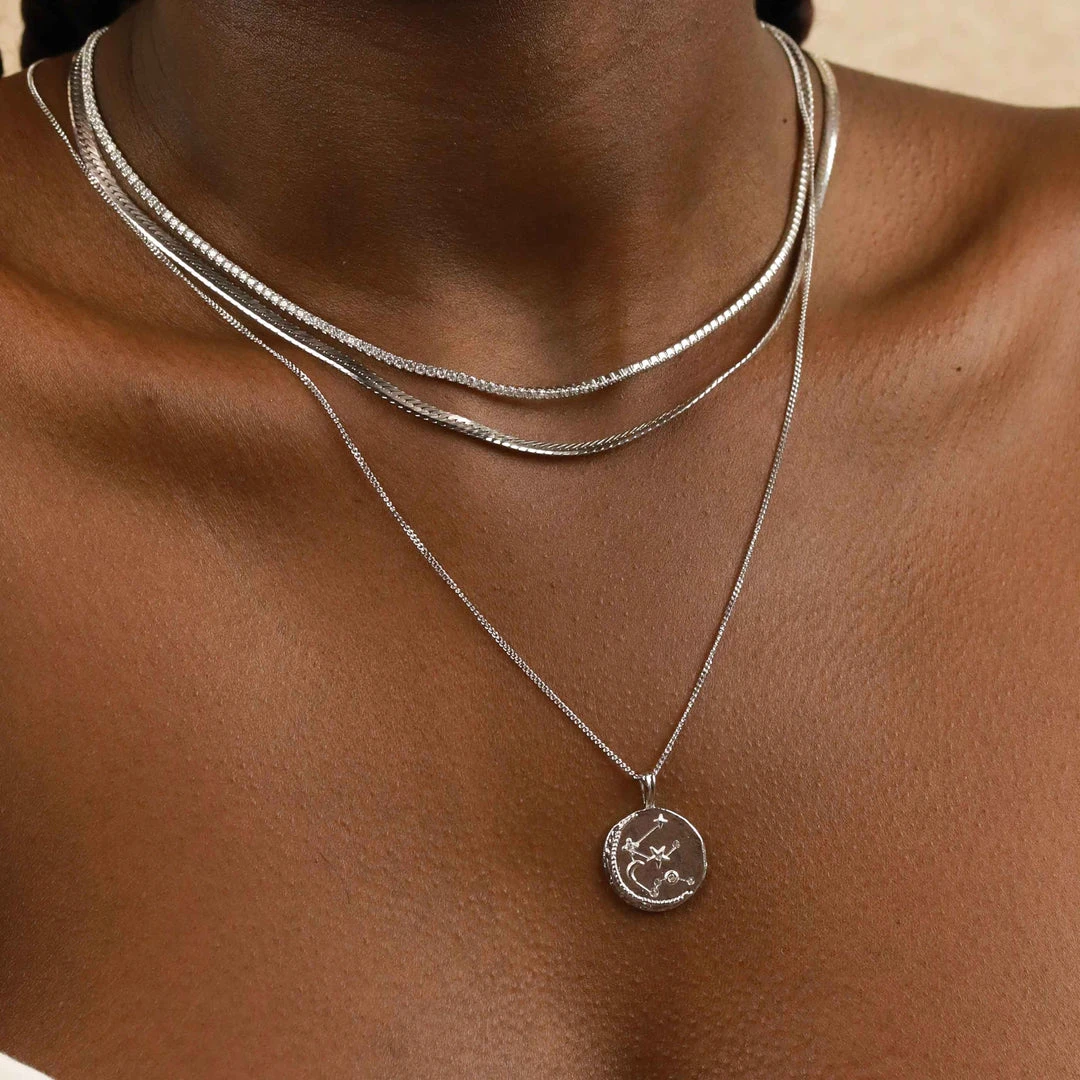 The Zodiac Aquarius Pendant Necklace in Silver features sparkling cubic zirconias to symbolise the Air element. Aquarius are notoriously free-spirited and eccentric, meaning that their necklace stacking has no limits. Layer this with chain necklaces and other pendants for a maximalist look.