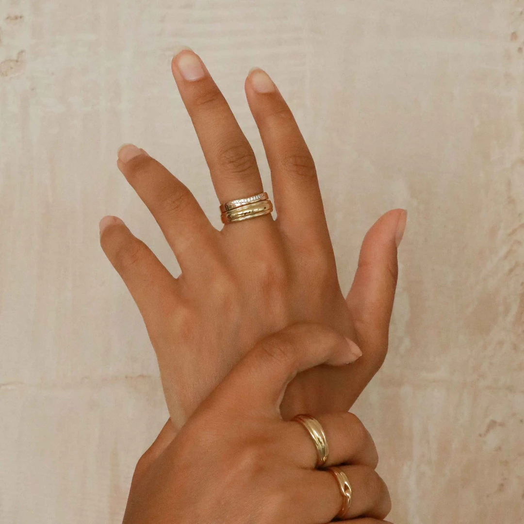 Ring stacking, the recycled way. The Ara Ring in Gold is made from recycled sterling silver & is paved in cubic zirconias so your fingers can stay shining. It’s not too dainty & not too chunky, meaning that it will fit in with you vibe, whatever your ring stacking style. Pair this with the Etched Band Ring and the Ara Hoops for a look you’ll want to wear all day, every day.