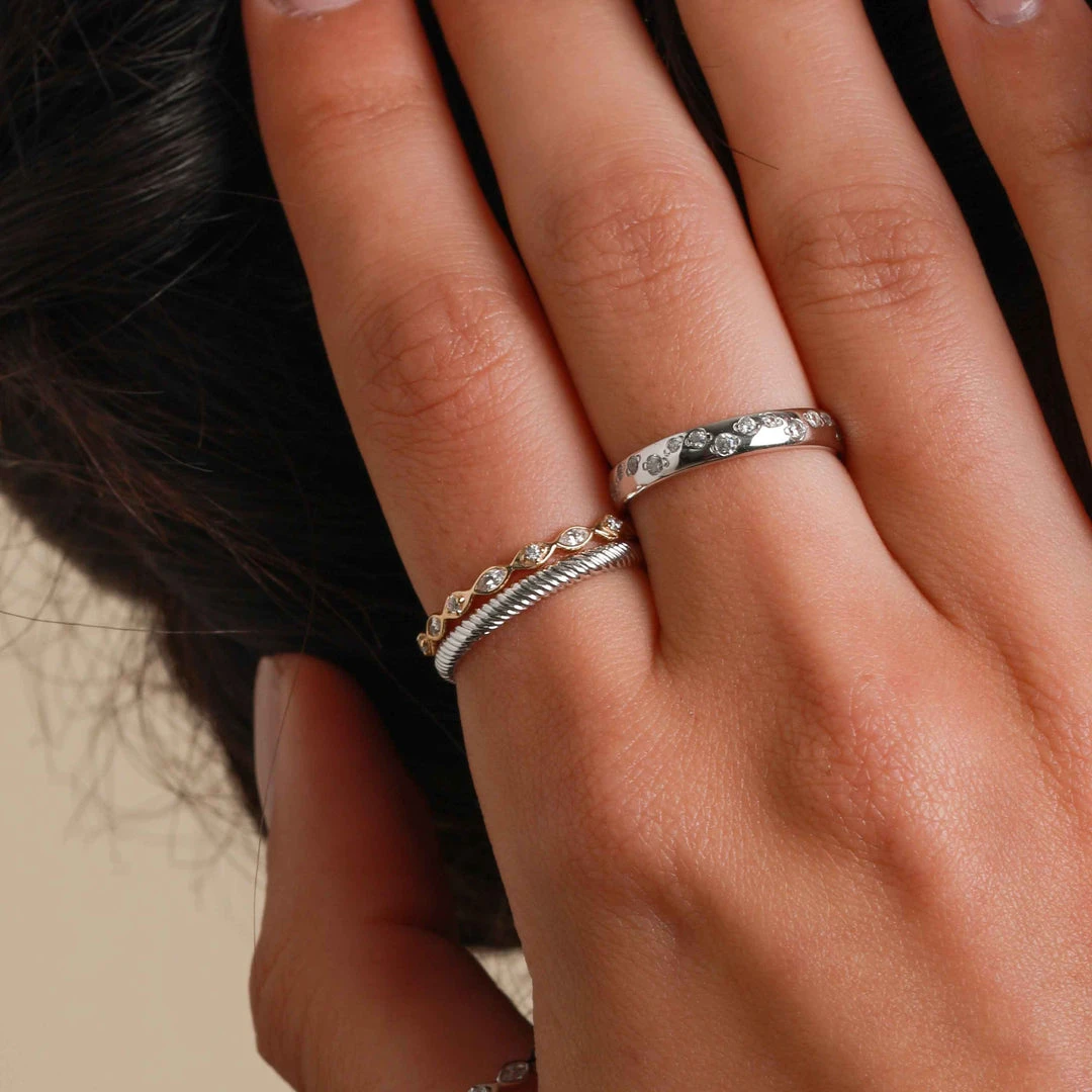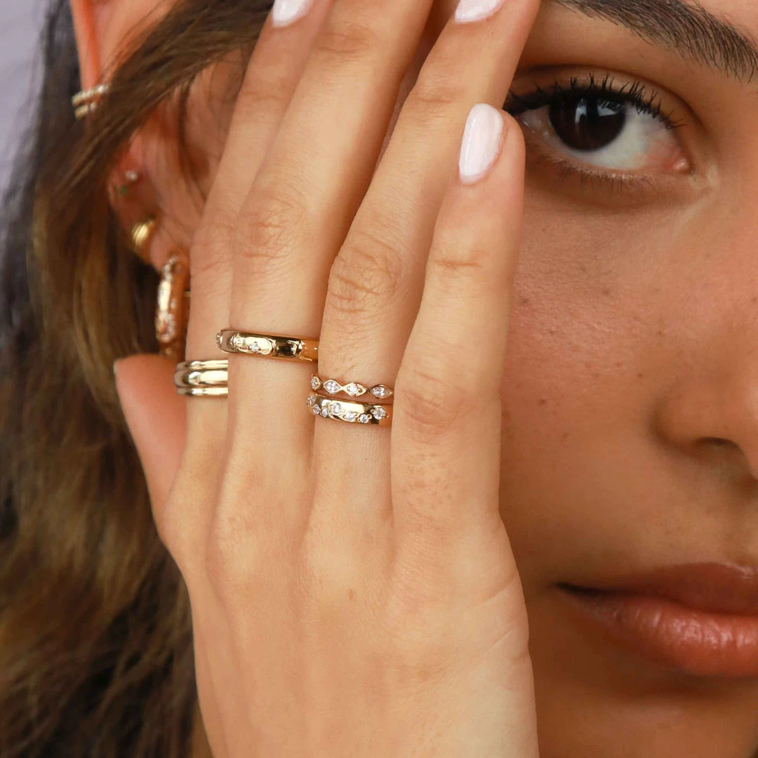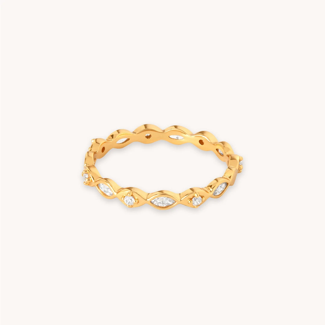 Achieve the ring stack of your dreams ~ add the Navette Crystal Band Ring in Gold to your collection for an all-out sparkling moment. With navette crystals all around, this is for when you want to let your hands do the talking. It’s on a dainty setting, so it’s easily stacked with other A&M ring styles.