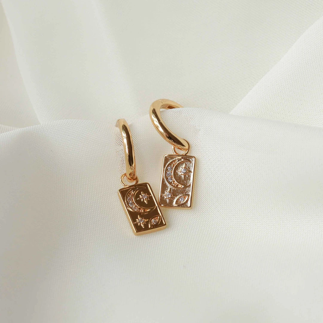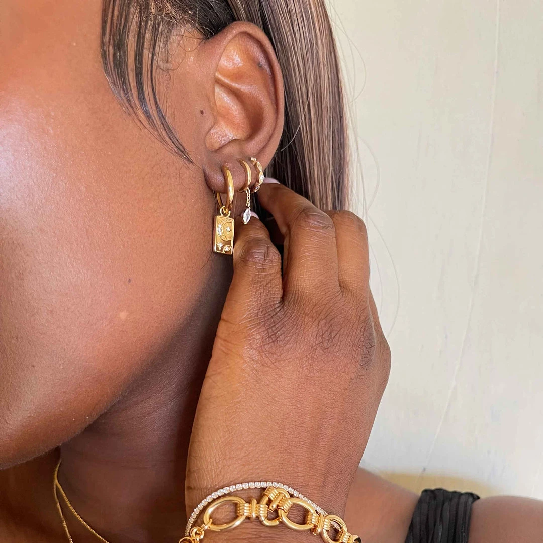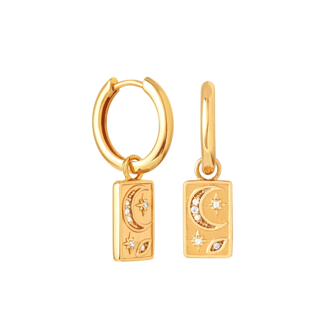 Stars in your eyes (and ears) ~ the Celestial Charm Hoops in Gold add a mystic vibe to your stack. Classically A&M, these feature dainty star & moon engraving on a rectangular charm for a statement look. Cubic zirconia inlays add a sparkling finish, so you can wear these to take your look from day to night.