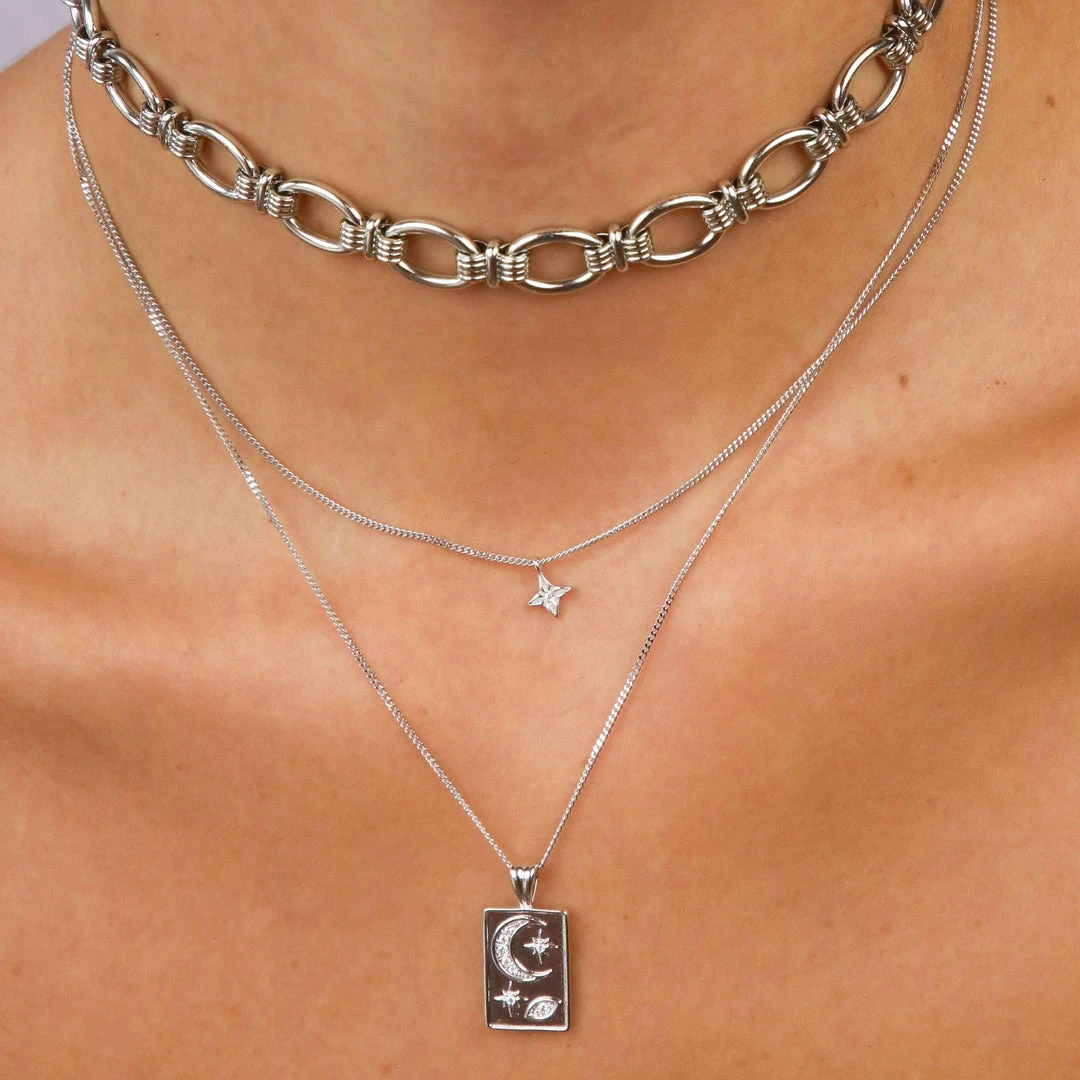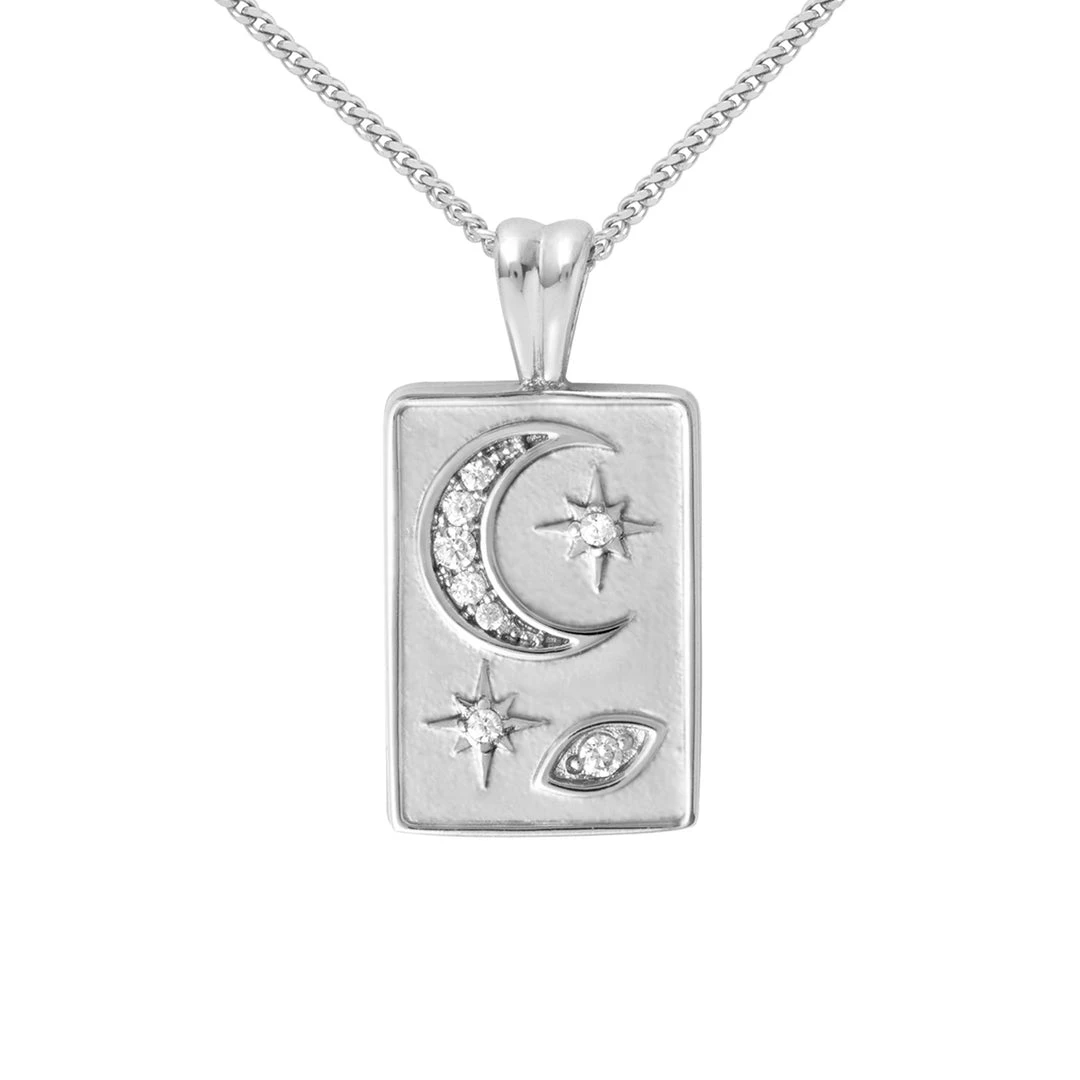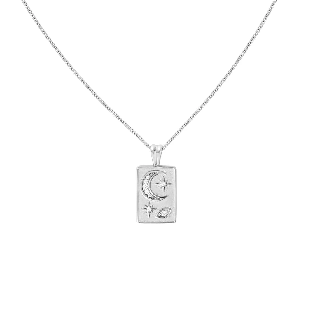 The necklace stack of your dreams ~ the Celestial Pendant Necklace in Silver is for all the mystics in your life (including you). Engraved in a dainty moon & star motif, this is in a rectangular ‘ID’ style to fit in with your existing necklace stack with ease. Layer it up with dainty pendants & chunky chain necklaces for a curated look to wear everyday.