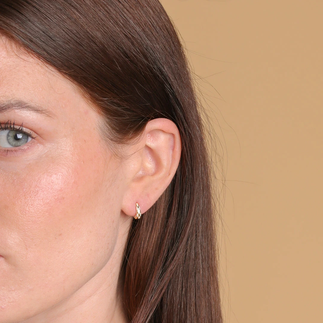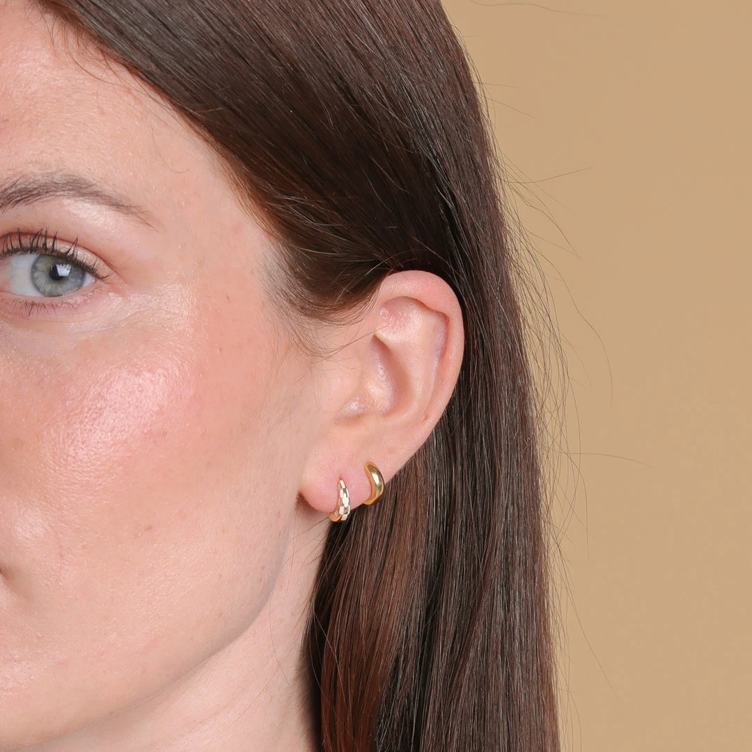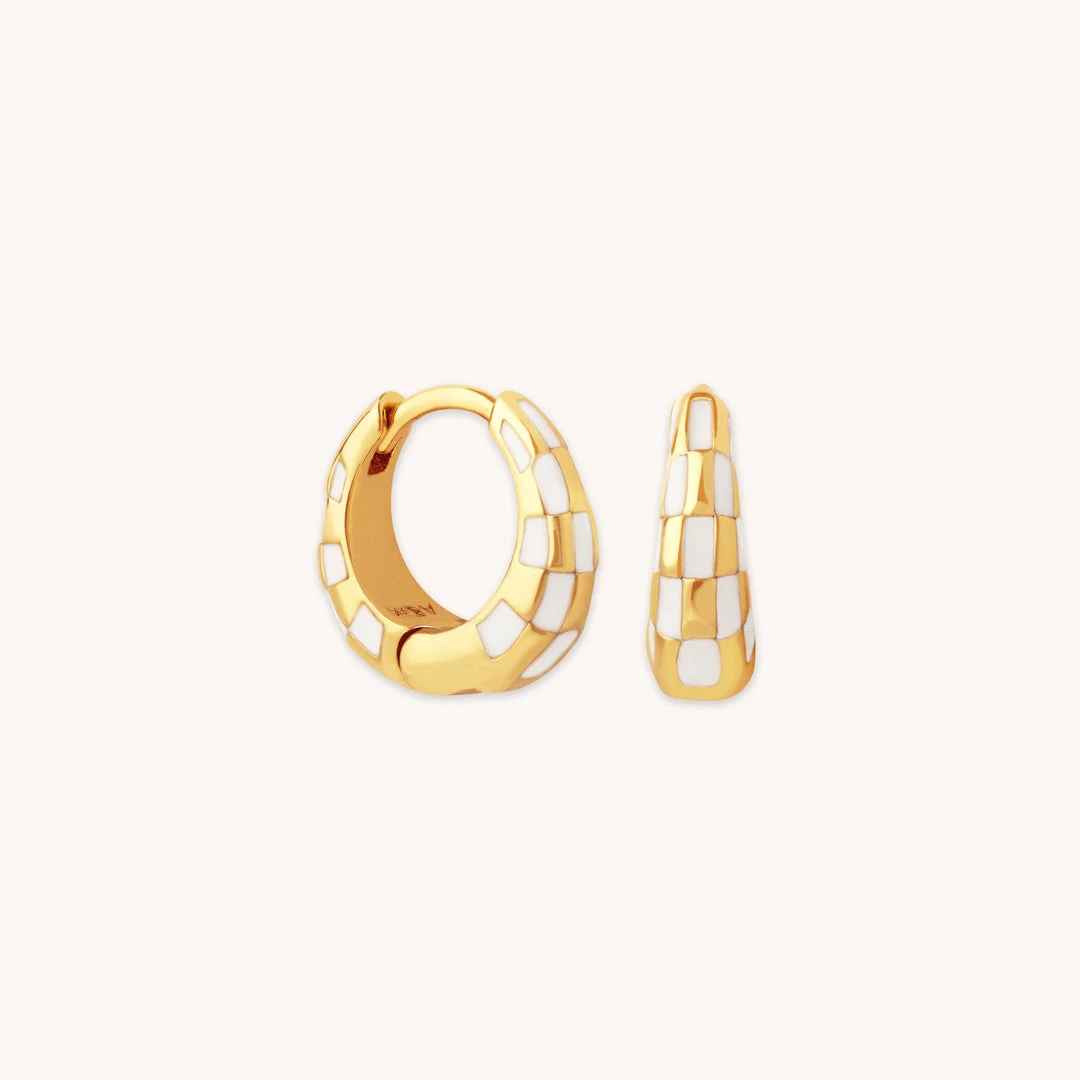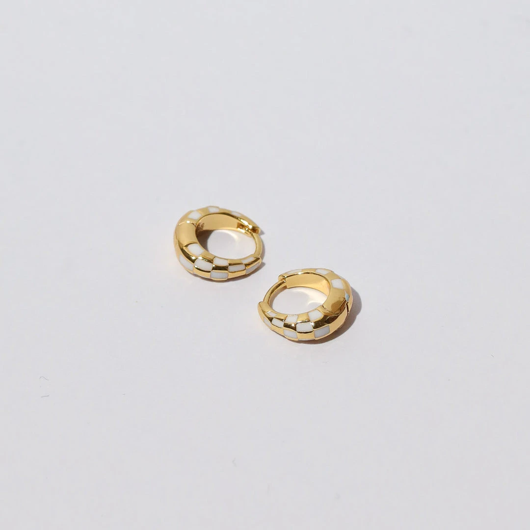 New huggies? Check. The Checkerboard Huggies in Gold are the fun statement your ear stack needs for summer. In our best-selling huggie hoop size, these feature a 70s-inspired checkerboard design to elevate your collection. Wear with the Checkerboard Pendant Hoops to coordinate the look.Â