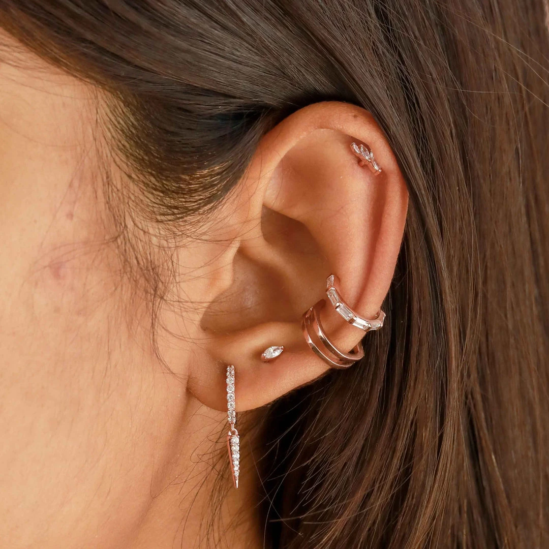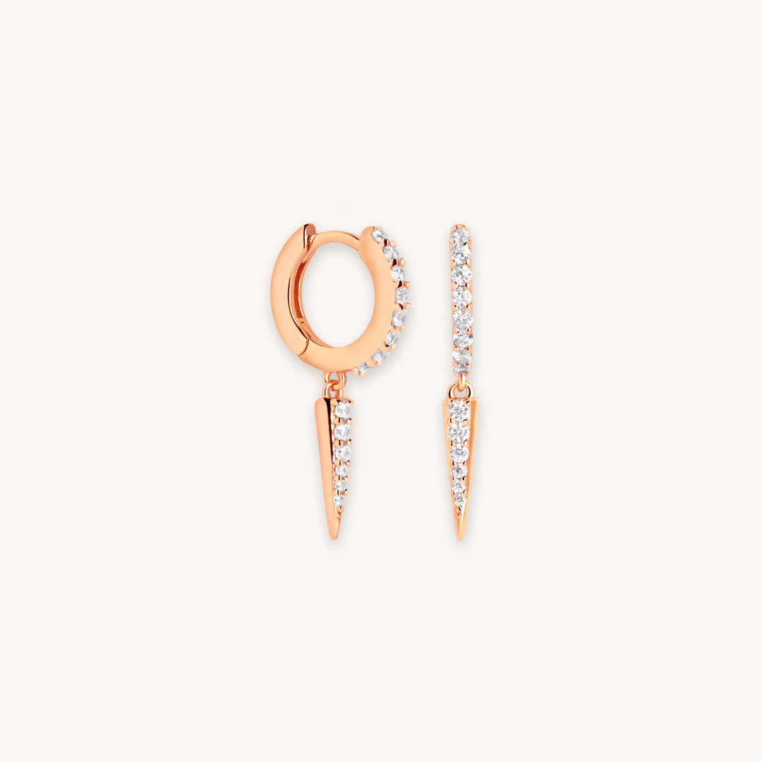 Huggies, but with an extra little something. The Crystal Spike Huggies in Rose Gold are paved in sparkling cubic zirconias for a statement look. A spike charm adds an eye-catching finish, and allows you to add different lengths to your ear stack. Wear them with our simpler styles for a stacked up look, or just on their own for an everyday vibe.