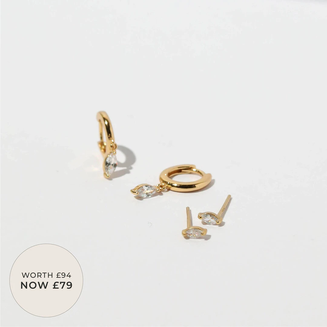 Including the key ingredients for the perfect stack, our Dainty Sparkle Stacking Set features elevated essential pieces. Our navette crystal setting is a chic way to add extra shine to your lobes – you can wear both of these together, or mix and match with your existing pieces.