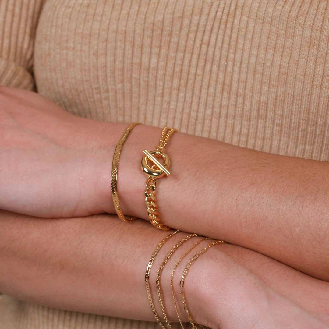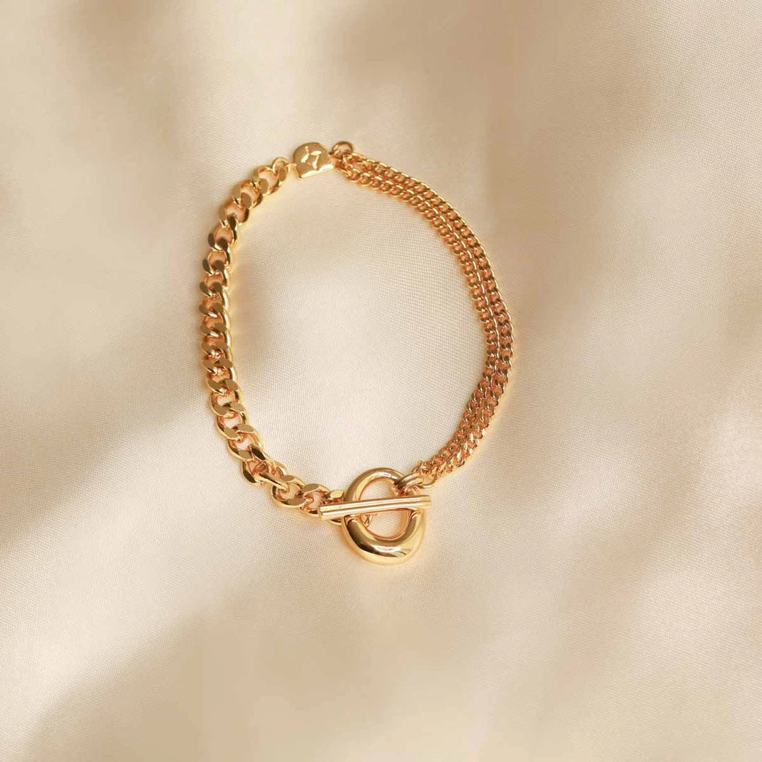 The bolder the better ~ the Duo T-Bar Bracelet in Gold is a statement addition to your wrist. Featuring a chunky T-bar fastening and two different chain styles, this bracelet is a simple & effective way of achieving the stacked look. Wear alone, or layer with other bracelets for a curated vibe.