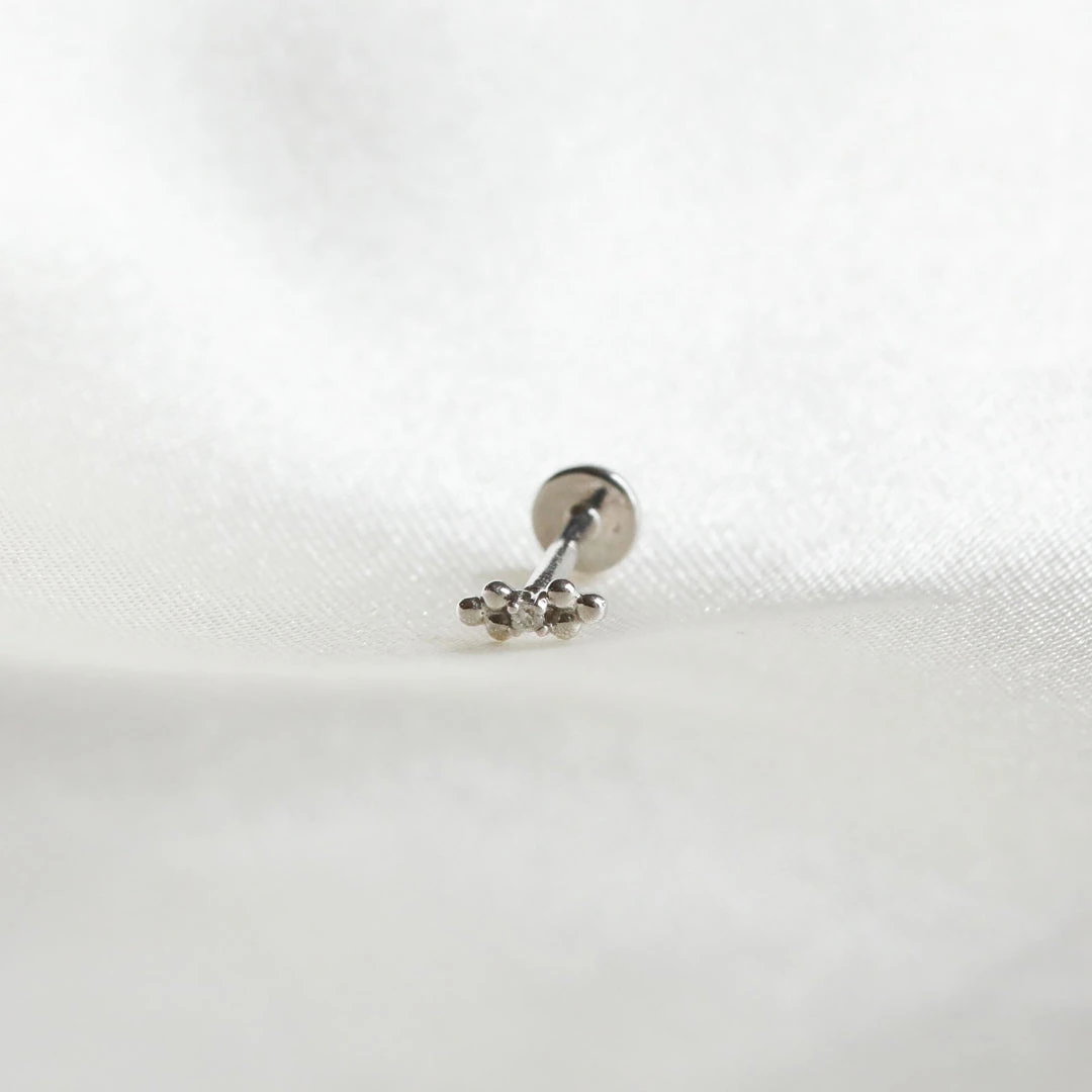 Statement sparkles for your piercings ~ the Solid White Gold Crystal Beaded Piercing Stud in Gold features a central crystal inlay with a beaded design above and below. It adds texture to your stack, and will fit perfectly in your lobe, tragus, conch or helix piercing.