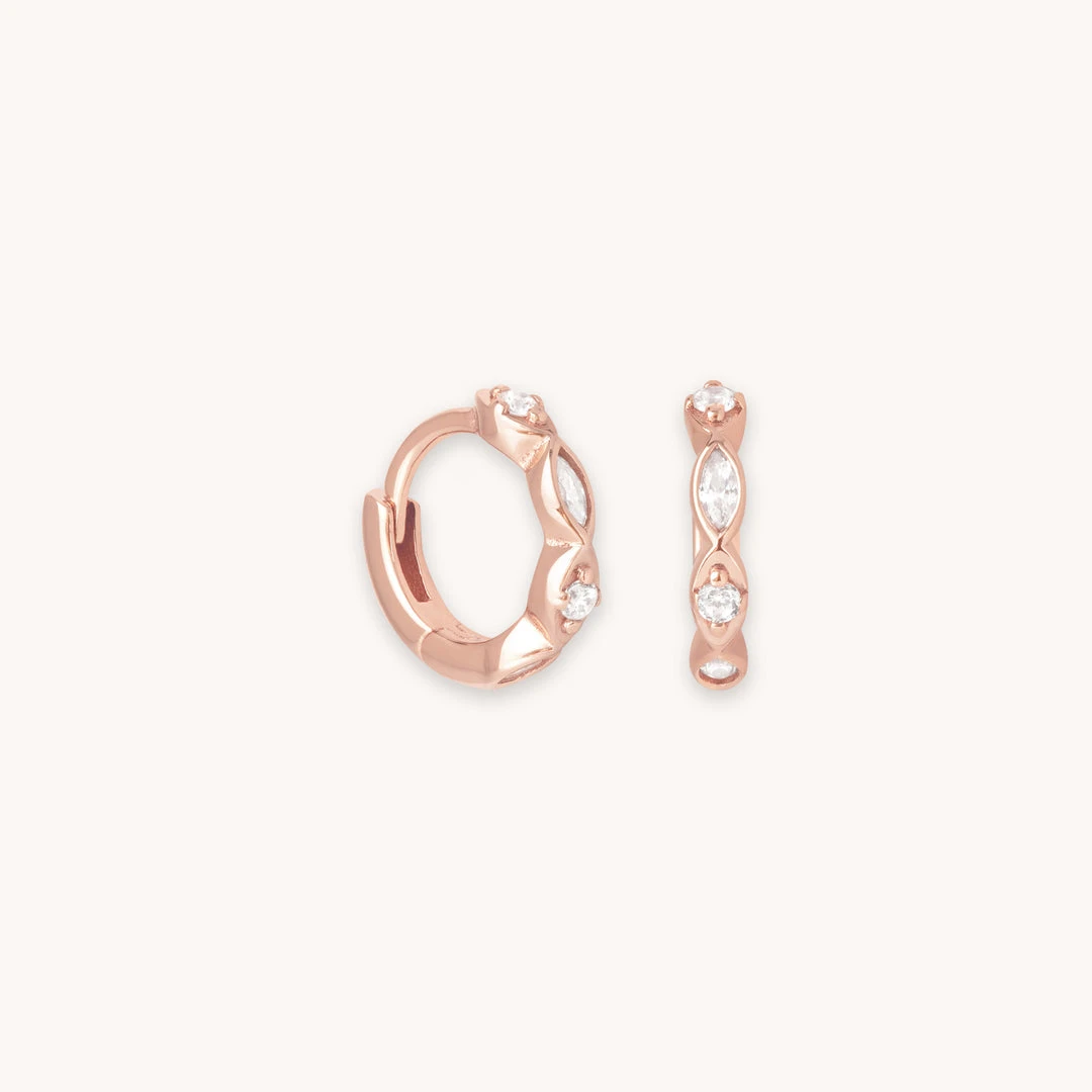 Huggies so sparkly they look out of this world. The Ethereal Crystal Huggies in Rose Gold give your ears the shine they deserve. They feature on-trend navette stones, which match our best-selling Navette Fan Barbells (perfect if you like to coordinate). Wear these in your first lobe piercing for an everyday look, or stack with chunky hoops & ear cuffs for a night-out vibe.