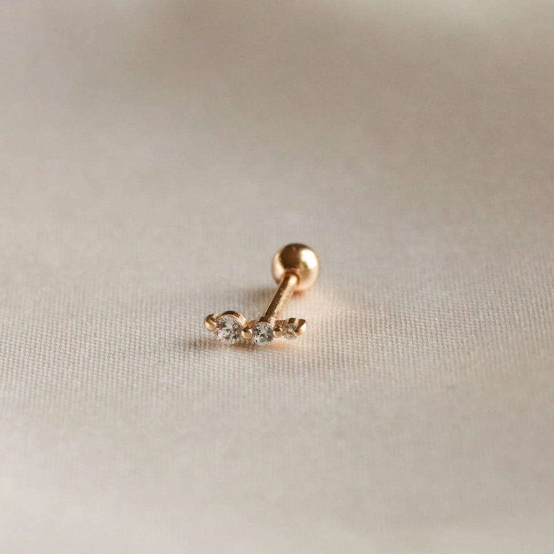 Treat yourself (and your piercings) to the Glimmer Crystal Barbell in Gold, featuring three shining cubic zirconias in a trailing shape. It will fit perfectly in your lobe, helix, conch or outer conch ~ it’ll give your piercings the attention they deserve. Wear it with any of our sparkly huggies or ear cuffs for the ultimate party stack.