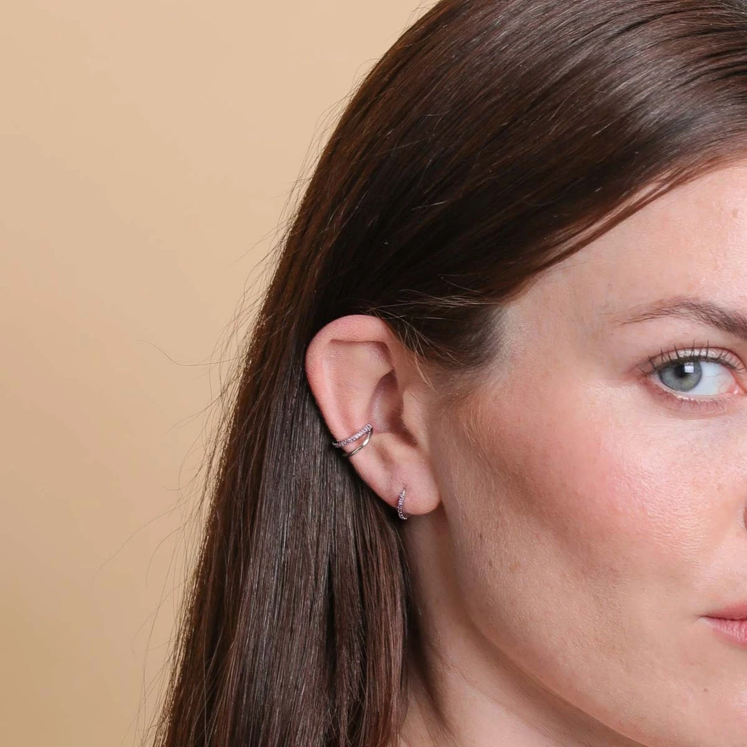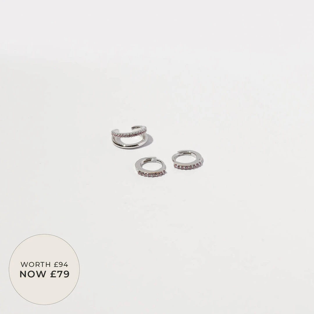 The Hope Stacking Set features pink crystals to symbolise hope & joy (as well as being adorable additions to your jewellery box). Including paved huggies and an illusion ear cuff, this set has everything you need for an elevated stack.