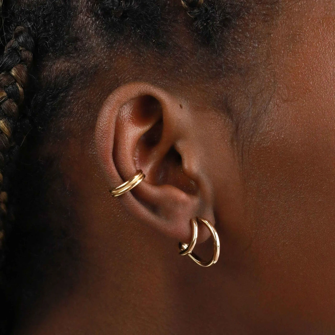 Two hoops in one? Yes please. Our Illusion Hoops in Gold are like our best-selling Illusion Crystal Hoops, but in a more minimalist design. With the illusion of a double lobe piercing, these hoops only need one – meaning you can achieve the stacked look without getting a piercing.Â