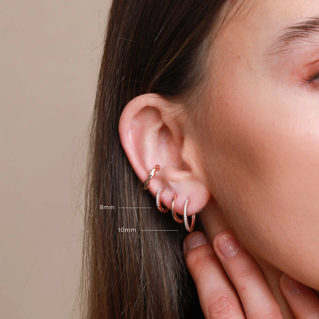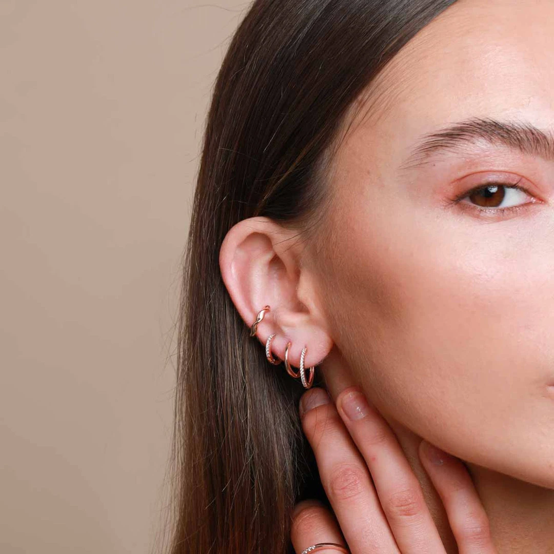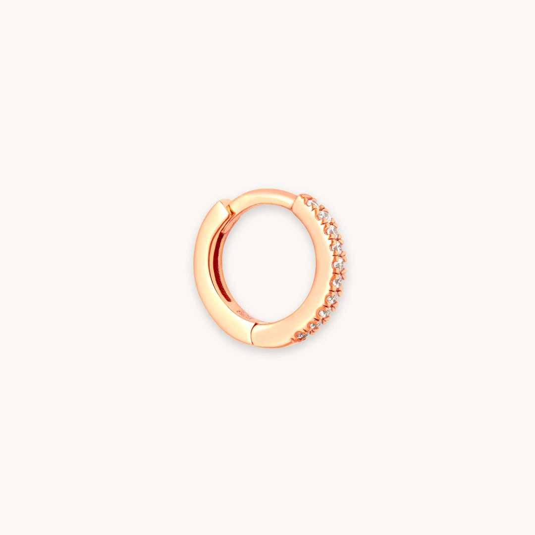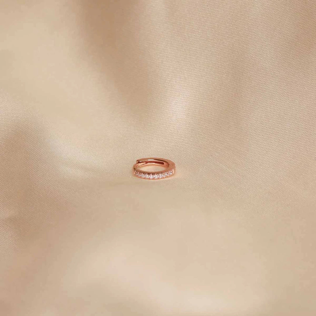 A sparkling addition to your stack ~ the Jewelled Hoop 8mm in Rose Gold is the perfect way to give your piercings the sparkle they deserve. Fitting in lobe, forward helix & helix piercings, this individual hoop means you can customise your stack and achieve the asymmetrical look.