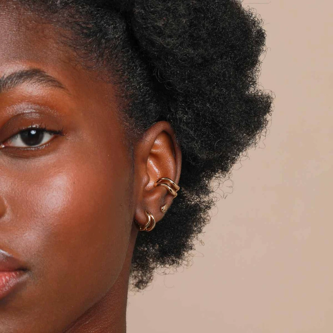 Organic textures serving as a reminder to embrace you for who you are ~ the Molten Duo Huggies in Gold are the everyday earrings you deserve. With the look of two huggies together, these are in a flowing molten metal design. Wear them alone, or stack with hoops & studs for curated lobes.