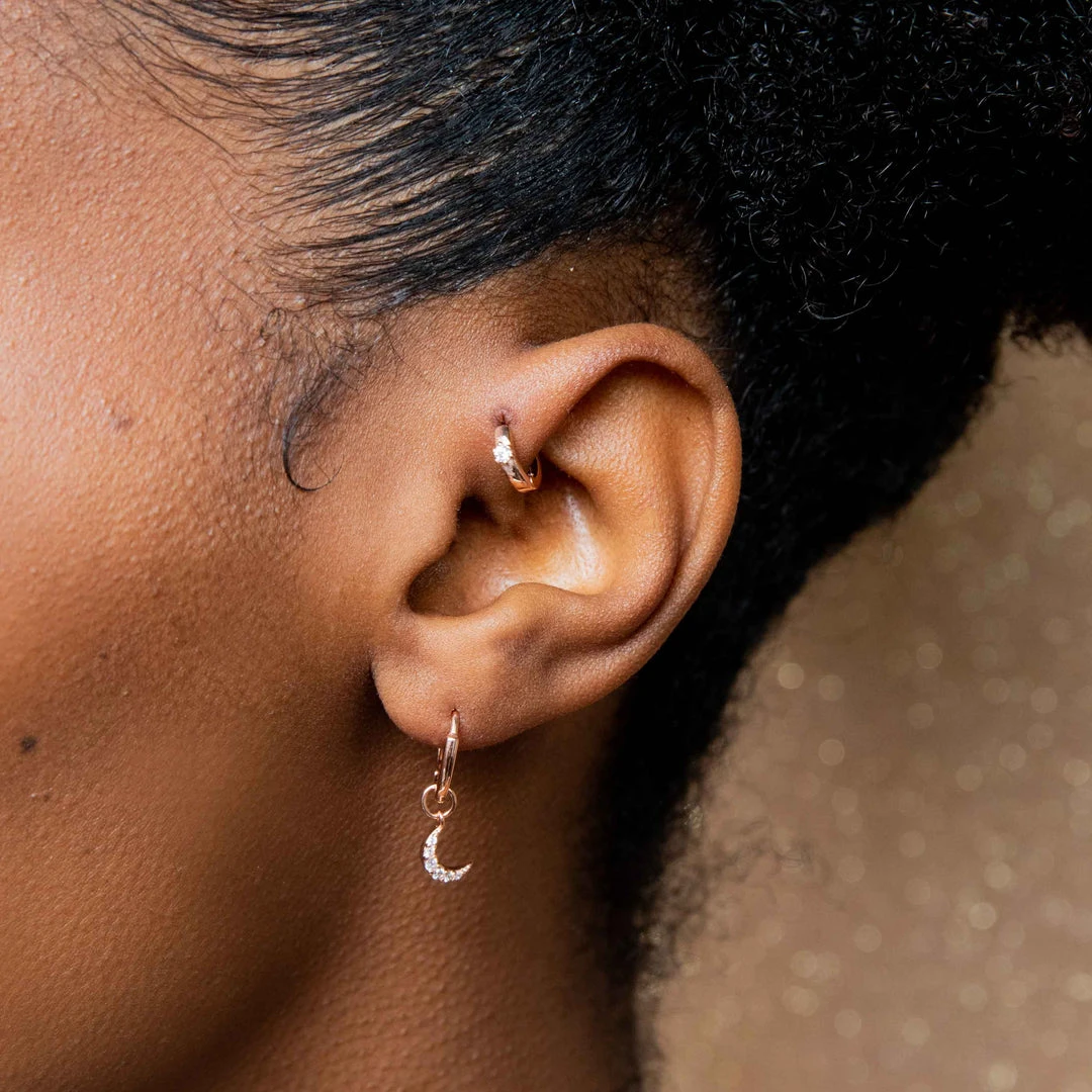 The perfect minimal statement, the Mystic Moon Crystal Hoops in Rose Gold adds a stellar vibe to your ear stack. With a crescent moon charm, paved with cubic zirconia stones, wear these hoop earrings with jewelled huggies & barbells for a sparkling look.