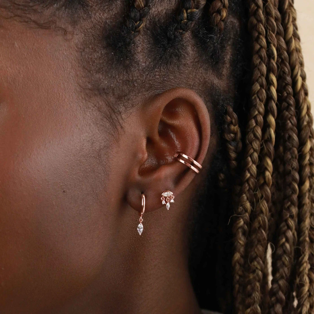 Simple huggies, with added sparkle. The Navette Charm Huggies in Rose Gold feature a dainty cubic zirconia in a marquise setting to add a sleek touch of sparkle. You can wear them in your first lobes for an everyday look, or stack them in your upper lobes with a pair of hoops for a going-out vibe. Pair with the Navette Long Chain Huggies or Navette Short Chain Huggies to add texture to your stack.