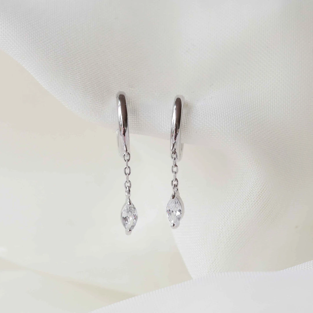 Your party ear stack isn’t complete without the Navette Long Chain Huggies in Silver. They’re your favourite A&M huggie fit but with a sparkling cubic zirconia suspended on a dainty chain, adding an eye-catching movement to your stack. You can wear them alone for minimalist look, or incorporate them into your curated ear stack for a going-out vibe. Pair them with the Navette Short Chain Huggies for a gradient look.