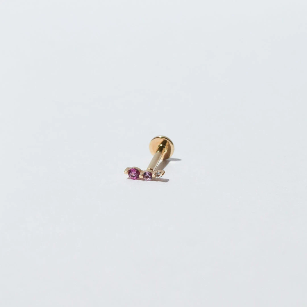 Add a pop of colour with the Pink Gradient Piercing Stud. With two shades of pink sapphire (symbolising love & compassion) and one white topaz stone (the stone of manifestation), this piercing stud adds a pretty pink sparkle to any stack. Wear it in your lobe, tragus, conch or helix piercing – and it’s made from 14k recycled solid gold so you can keep it in your piercings year after year.