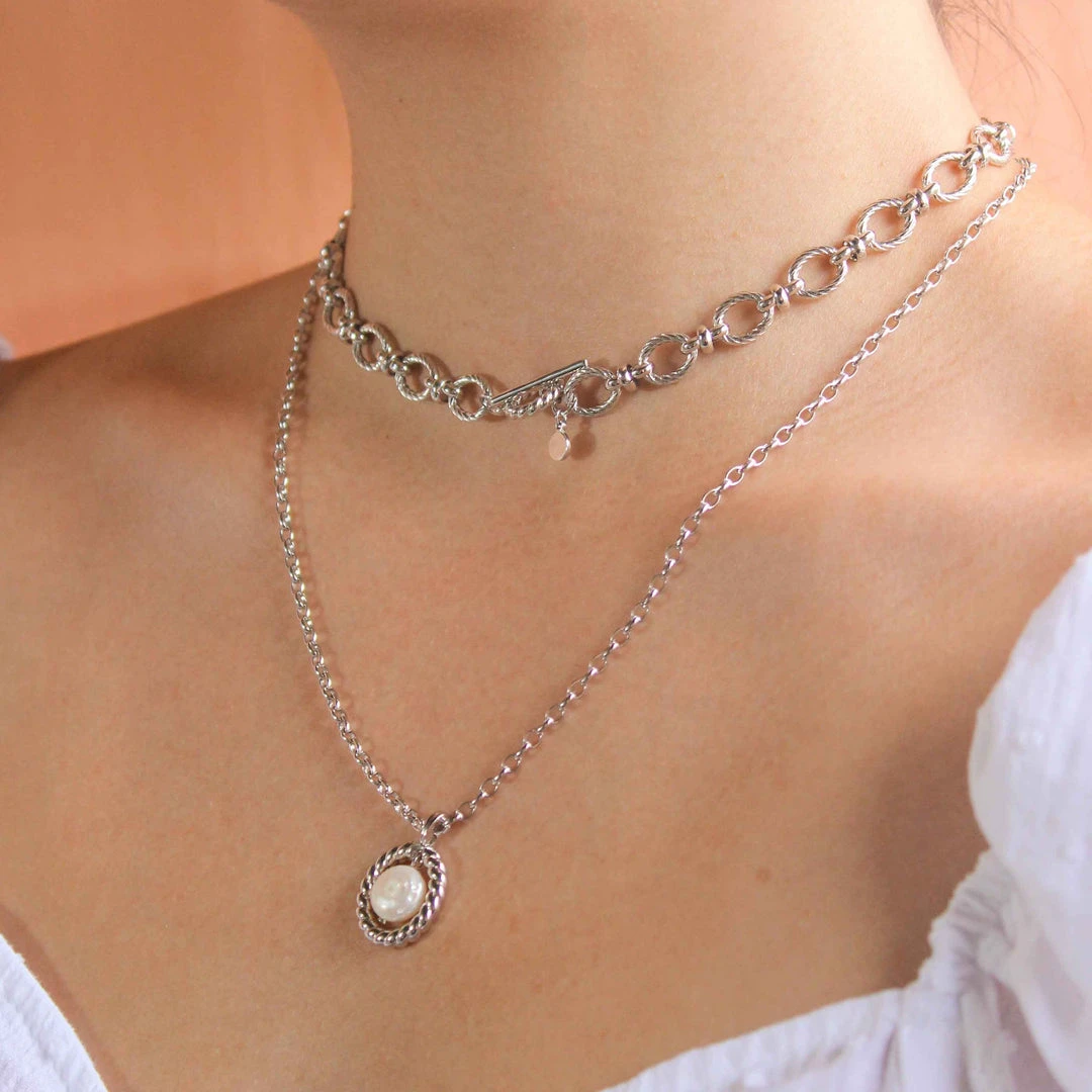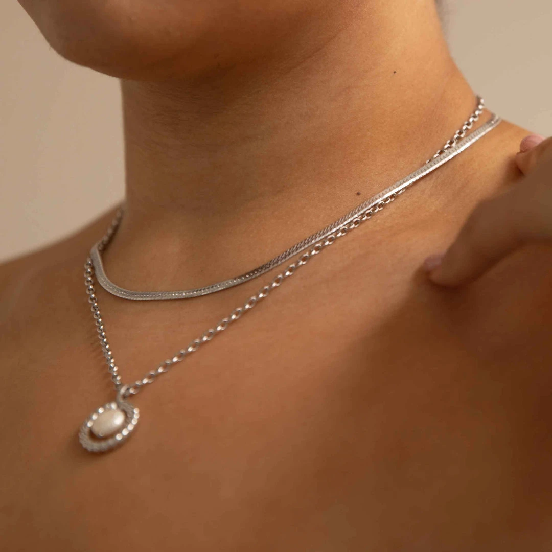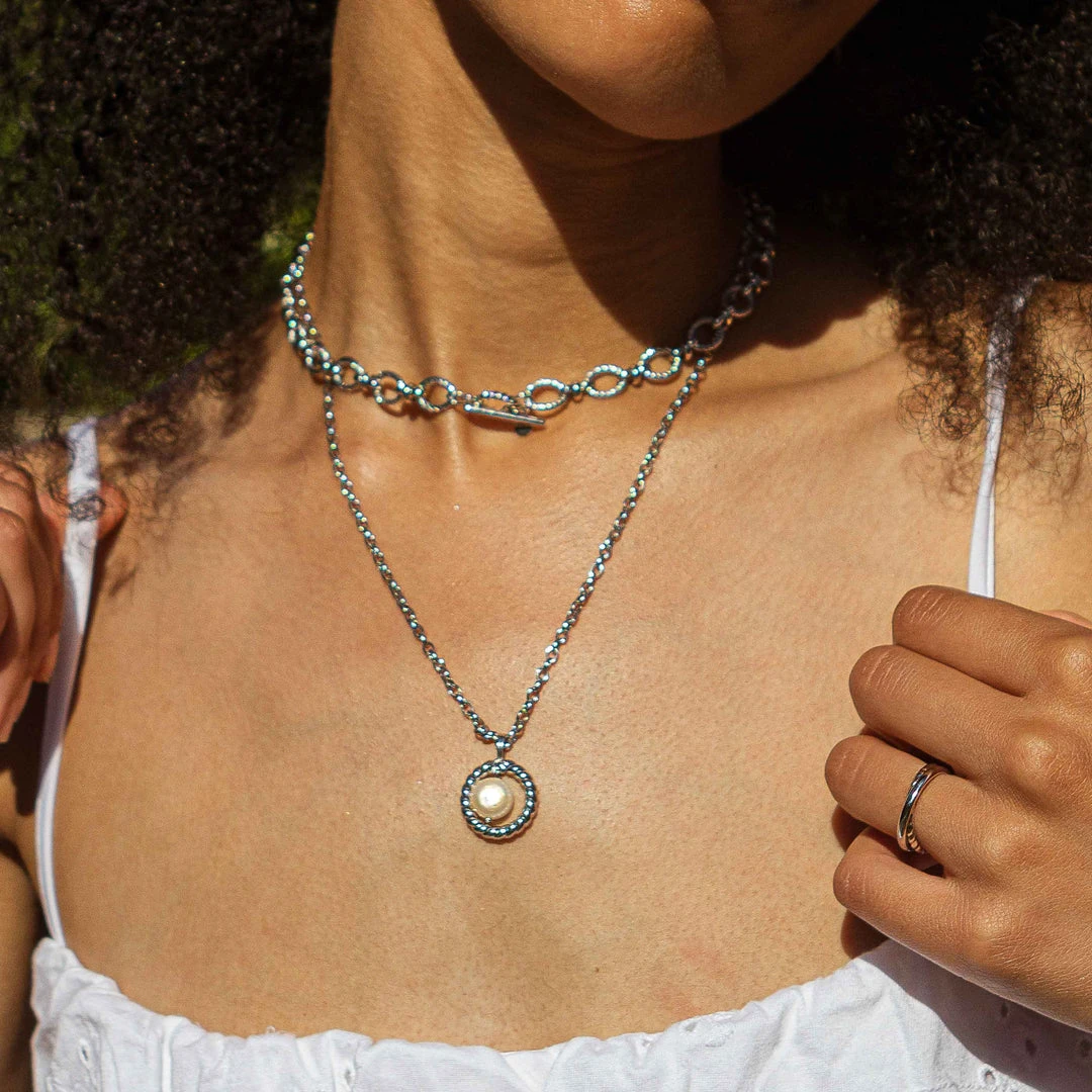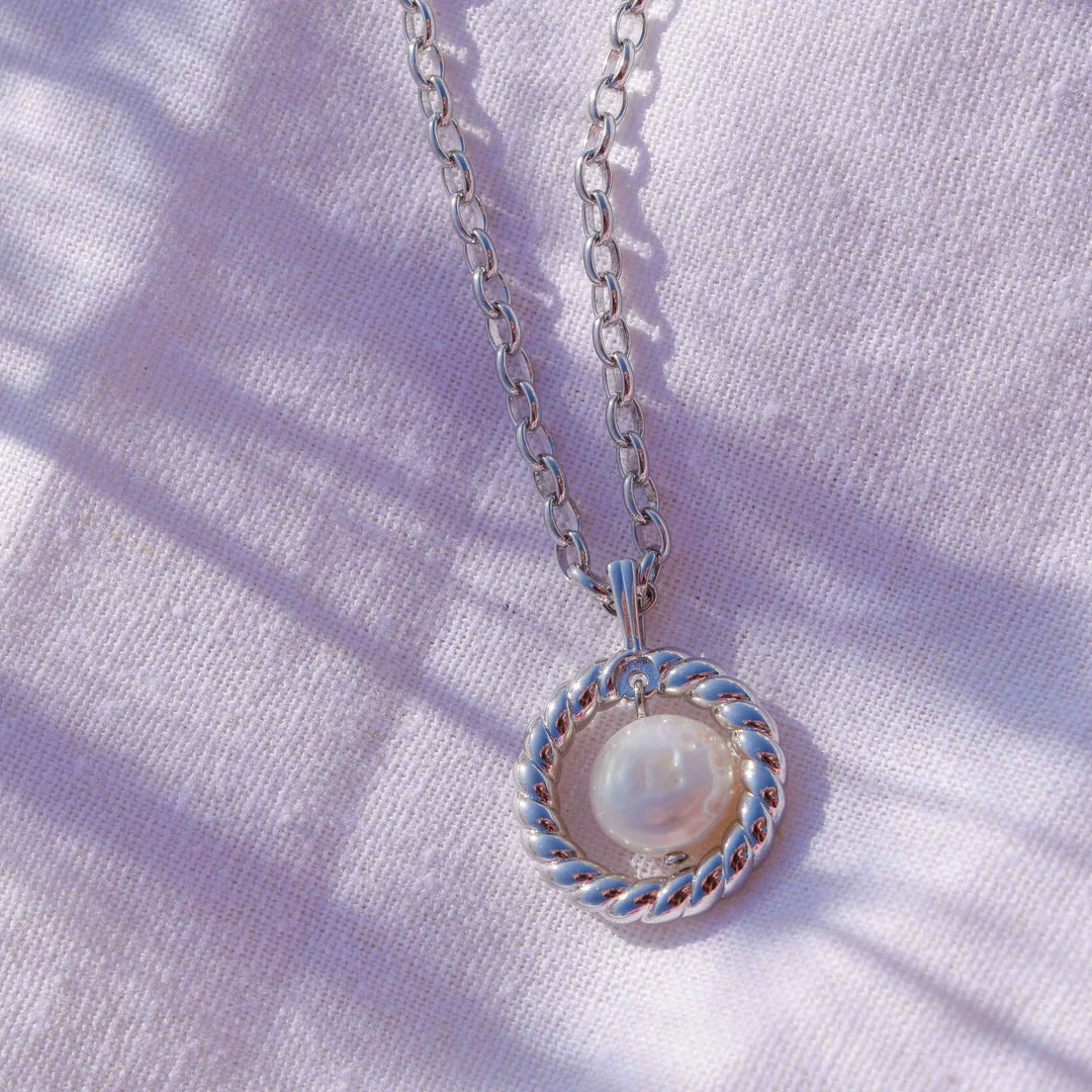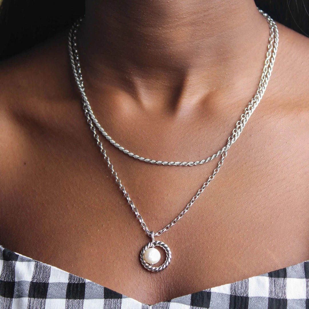 Introducing the Rope & Pearl Pendant Necklace in Silver. On a chunky chain, it features a round pendant with a sleek freshwater pearl inlay. The result? A beachy, yet chic finish that you’ll want to wear all year round.
