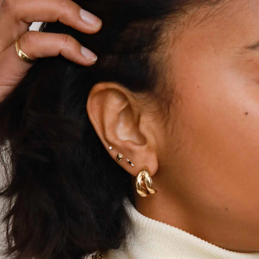 In a molten metal design, the Molten Large Stud Earrings in Gold are an everyday go-to piece. They’re ideal for wearing alone in your first lobe piercing for an everyday look, or with hoops to add a luxe molten texture to your stack.