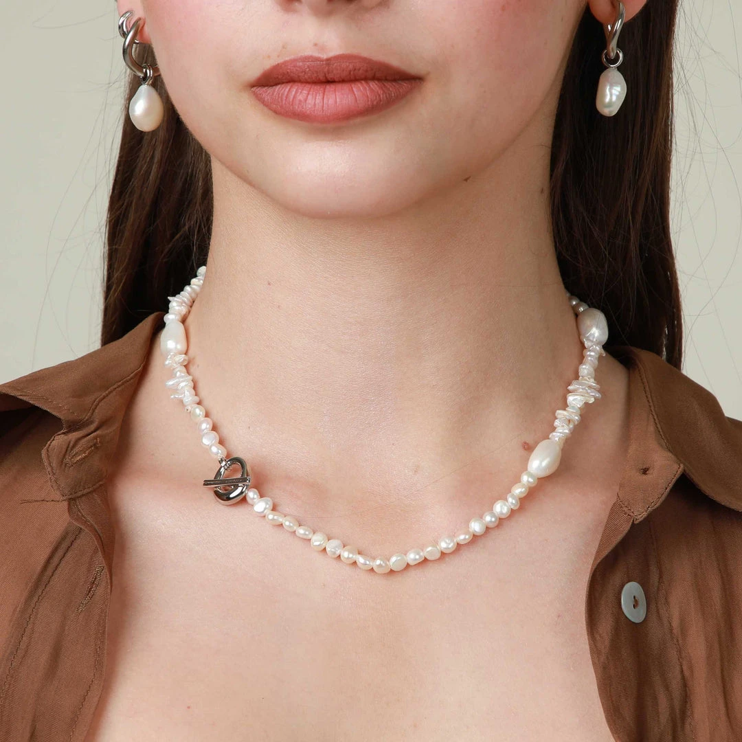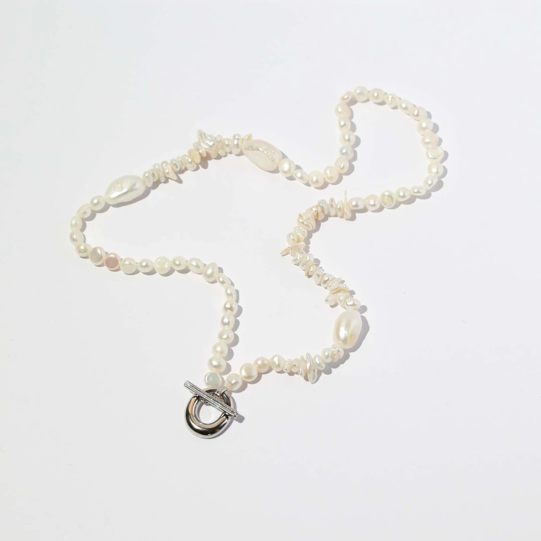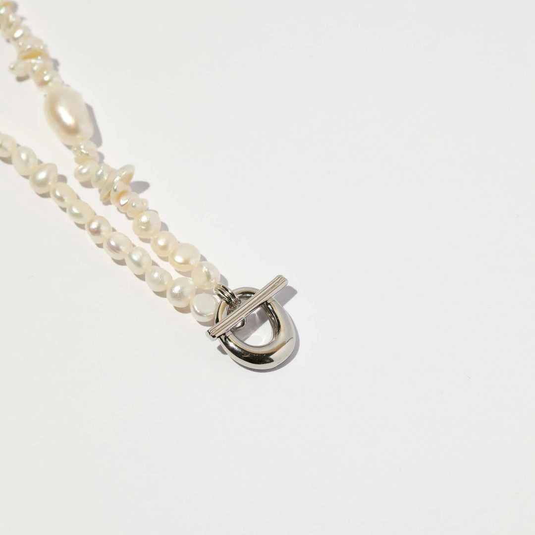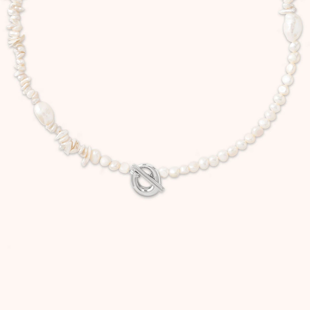 A pearl of wisdom: the Serenity Pearl Beaded T-Bar Necklace in Silver is the perfect addition to your summer stack. With freshwater pearls in organic shapes and textures, this necklace features a bold T-bar closure to add a sparkly touch. Perfect for summer getaways and events, this timeless necklace will take you through all the seasons – making it a dreamy investment piece.