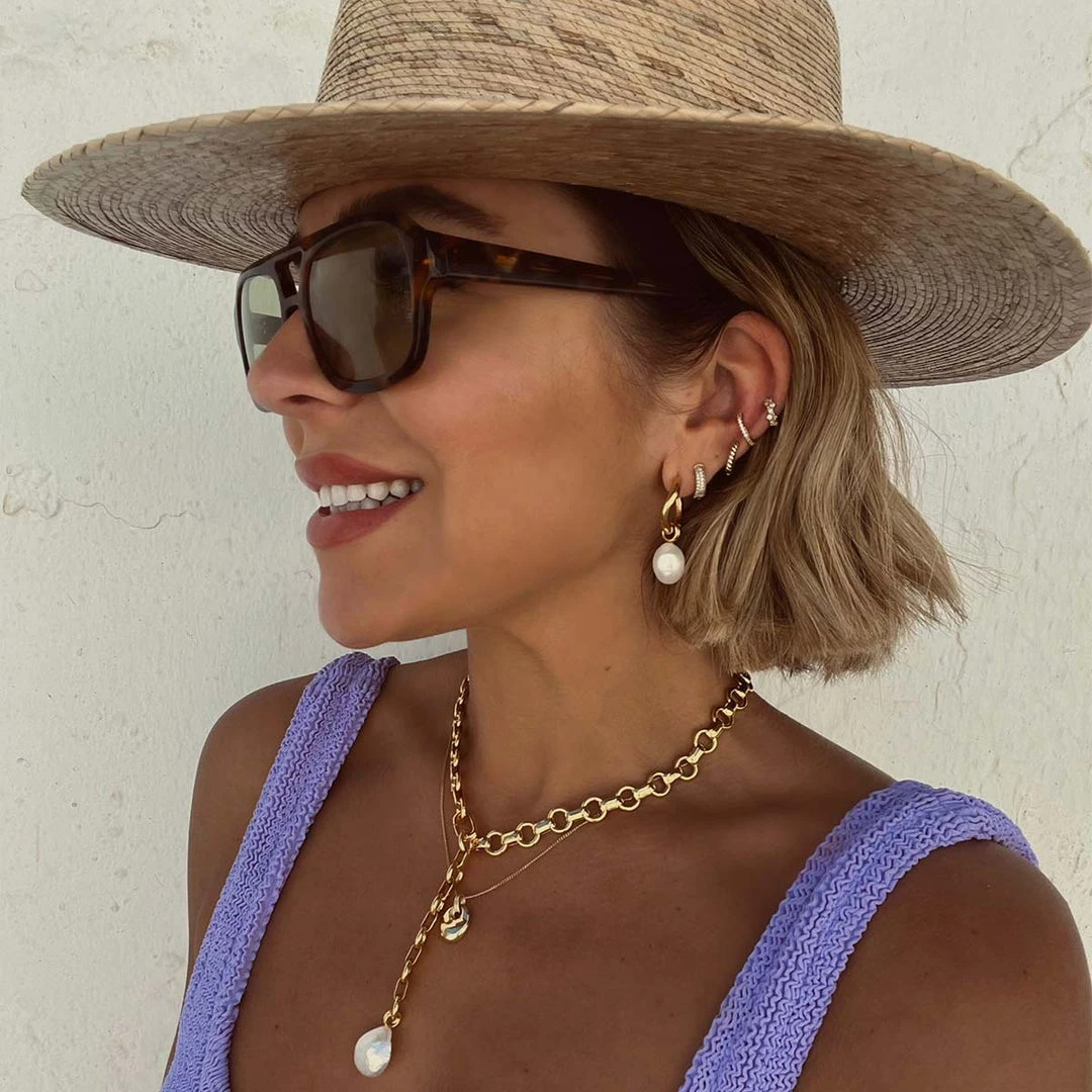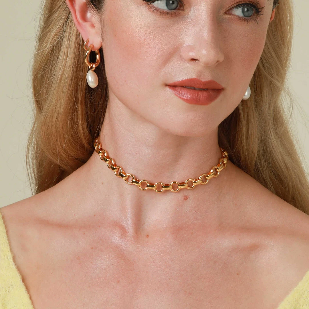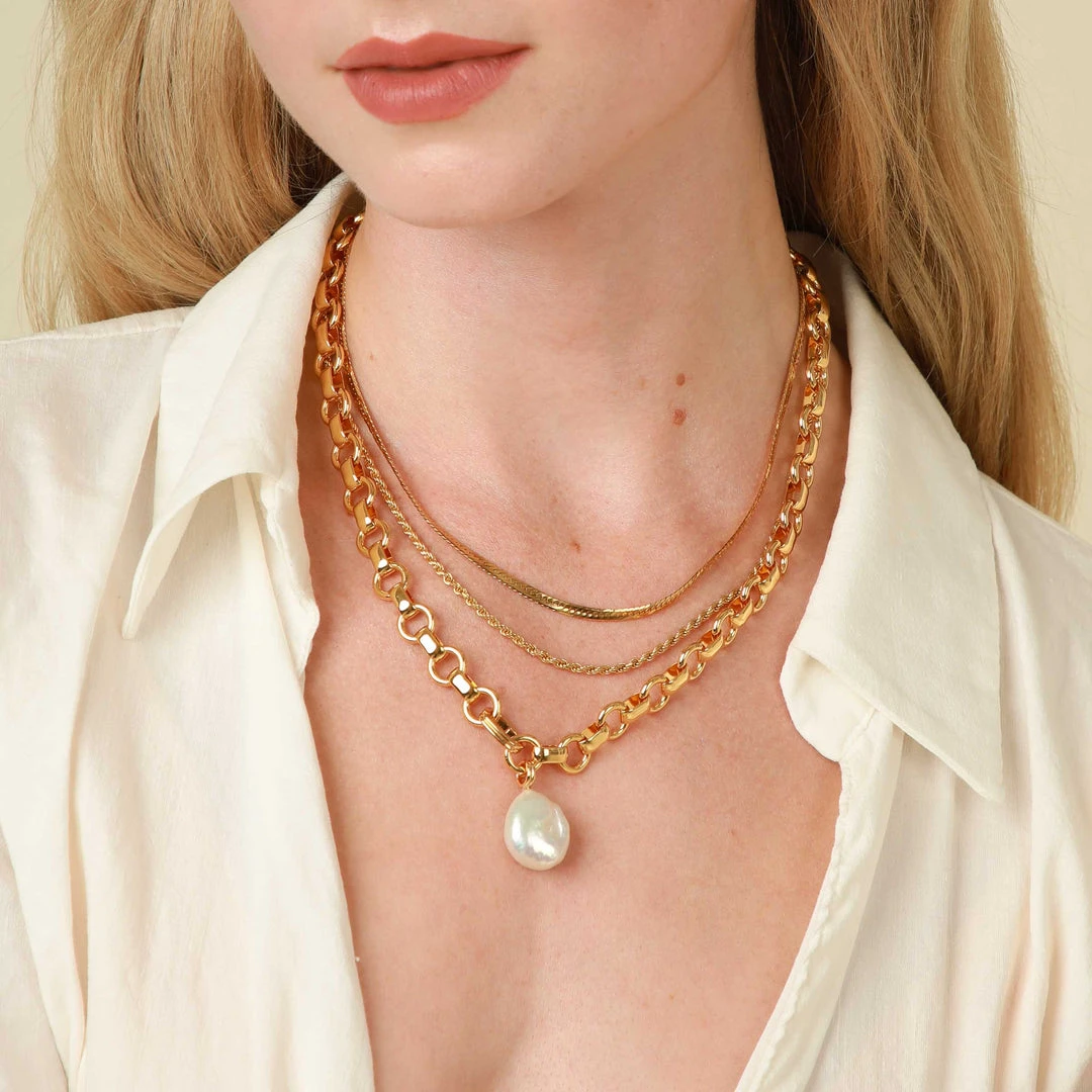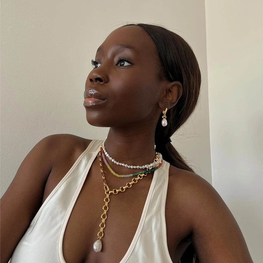 The world is your oyster. The Pearl Link Chain Necklace in Gold is an elevated staple piece. With a chunky link chain, it features a freshwater pearl charm in an organic shape for an opulent feel. The clasp can be fastened at any point on the necklace, meaning it can be worn as a classic chain necklace or as a lariat. Pair with the Pearl Beaded T-Bar Necklace for the ultimate summer stack.