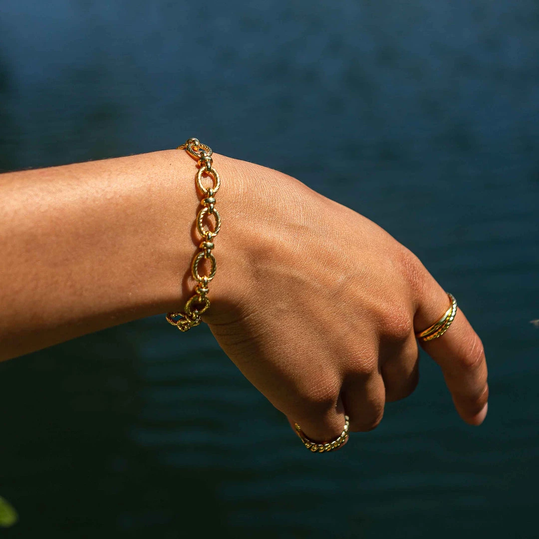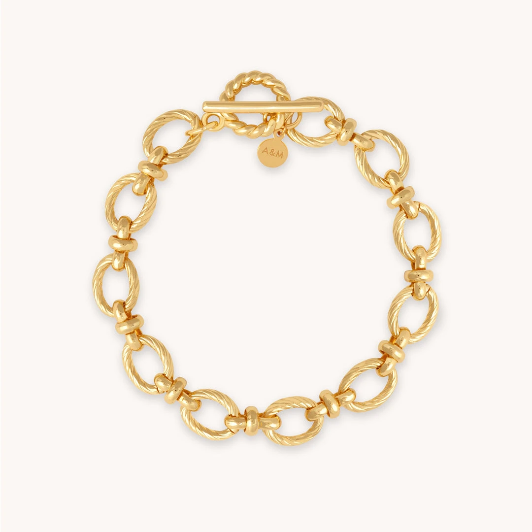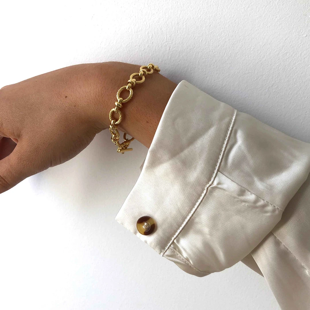 Chunky and classic, our textured gold t-bar bracelet simply screams vintage vibes. Perfect for styling with rings or match with a pair of chunky gold hoops for a coordinated look. Explore your style and follow us on Instagram for more inspiration.