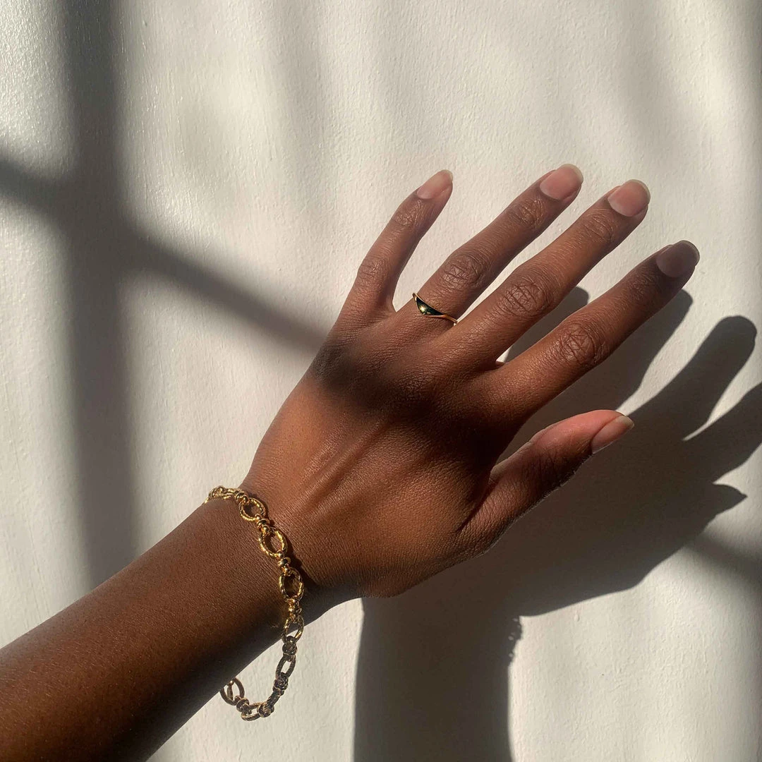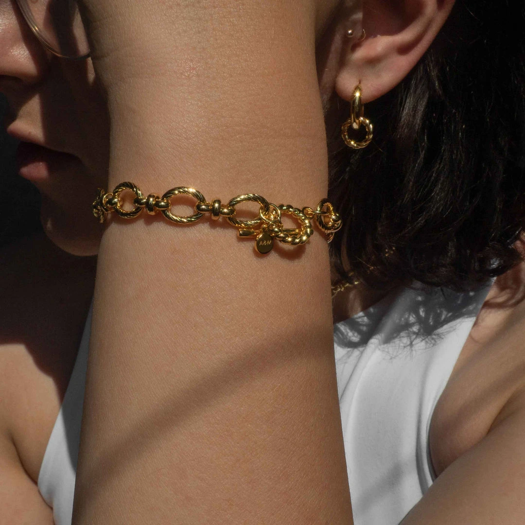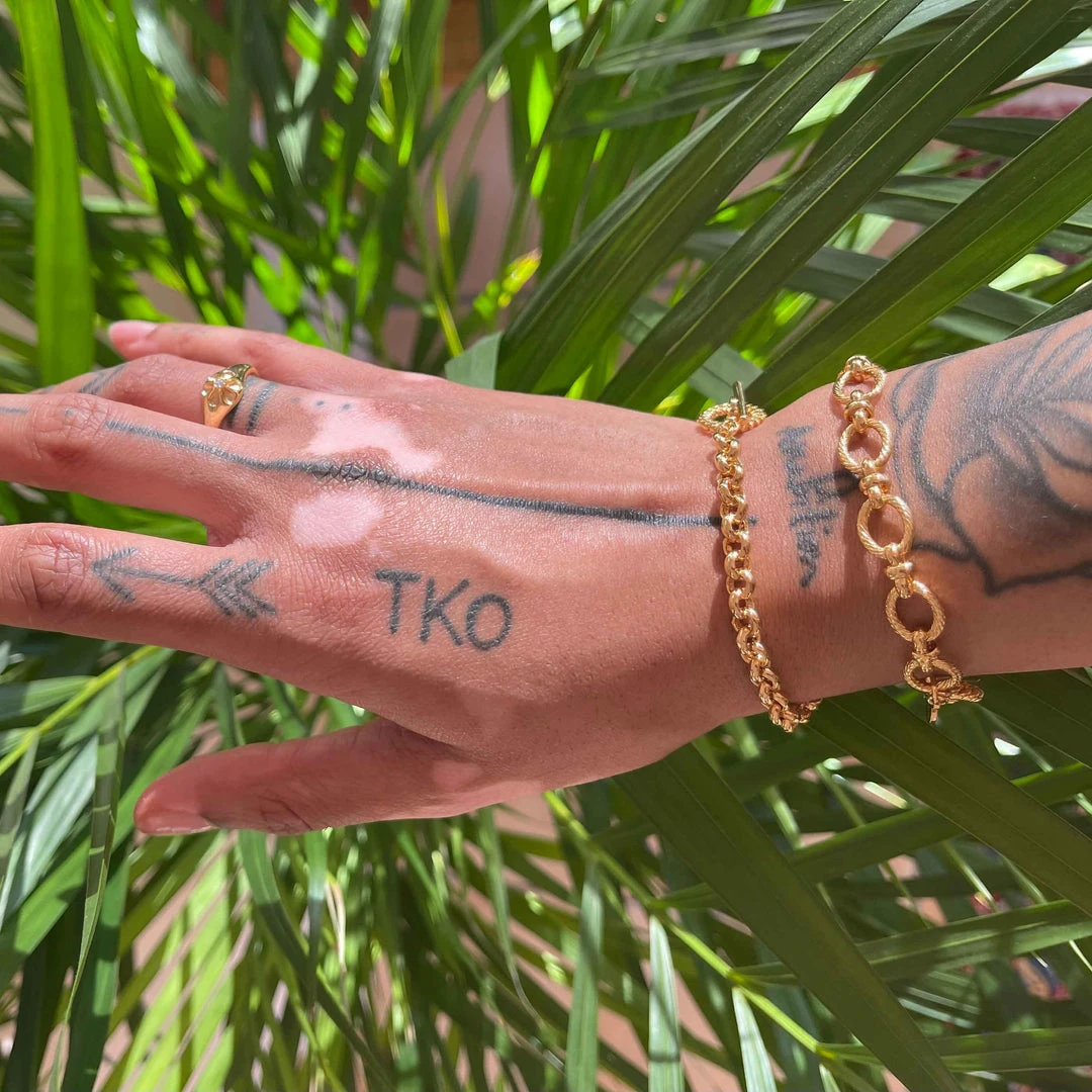 Chunky and classic, our textured gold t-bar bracelet simply screams vintage vibes. Perfect for styling with rings or match with a pair of chunky gold hoops for a coordinated look. Explore your style and follow us on Instagram for more inspiration.