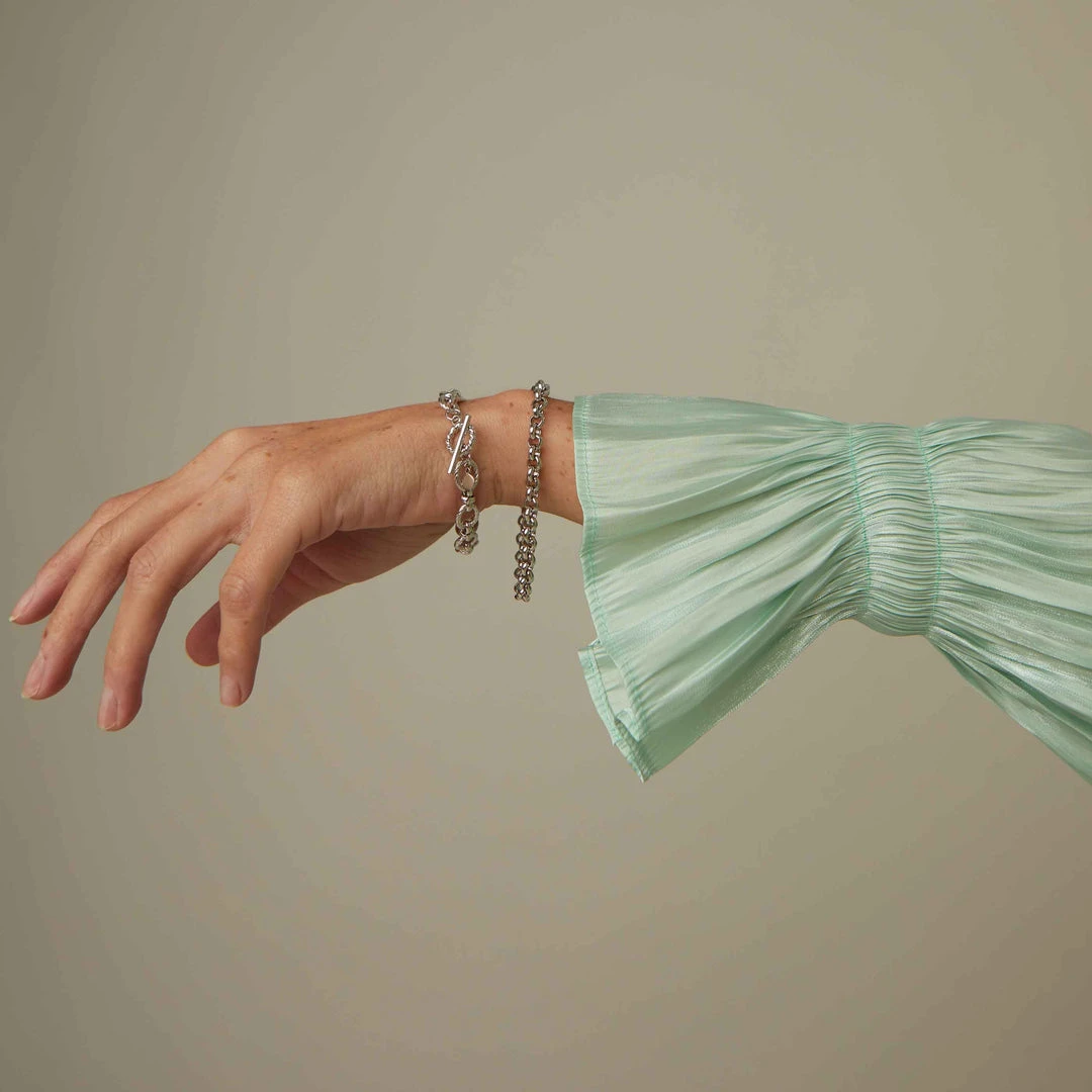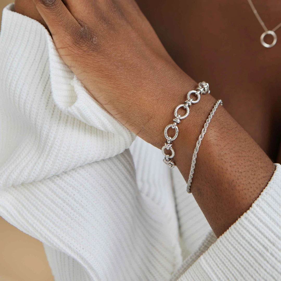 Chunky and classic, our textured silver t-bar bracelet simply screams vintage vibes. Perfect for styling with rings or match with a pair of chunky silver hoops for a coordinated look. Explore your style and follow us on Instagram for more inspiration.