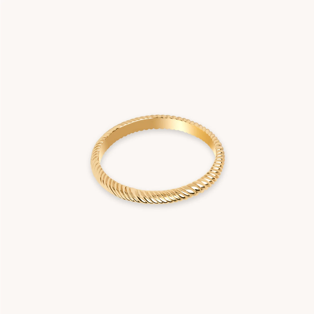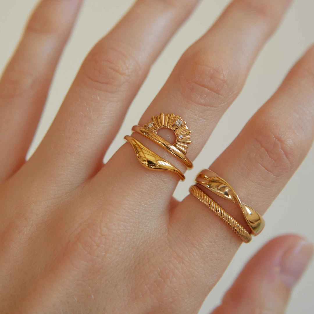 A ring stacking staple you won’t be able to live without… Introducing the Etched Band Ring in Gold. It’s in a simple band style, but is elevated with a luxe texture – it’ll look great with any of our more statement rings, or to stack with your favourite rings in your own collection. Add the Etched Crystal Hoop Earrings to complete the Aurora look.