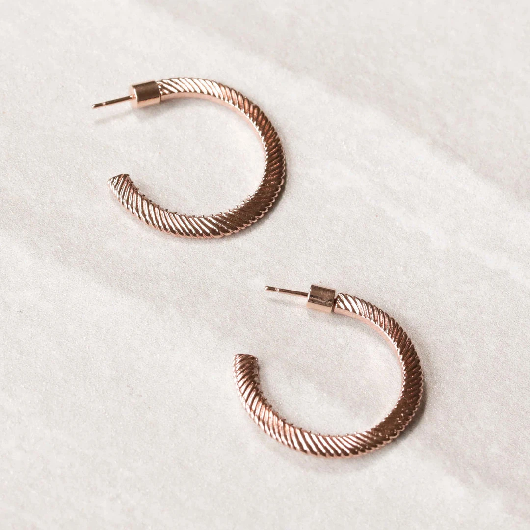 Let your light shine with the Etched Crystal Hoop Earrings in Rose Gold. These hoops have a luxe textured finish to mimic beams of sunlight. And the best bit? They have a secret trail of cubic zirconias along the back of the hoop to add extra sparkle. Wear these hoops to all your post-lockdown events, when you want to feel extra shining. Want the full Aurora Collection glow? Pair these with the Etched Band Ring.