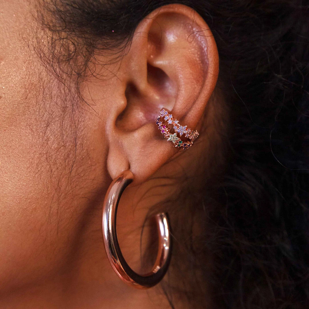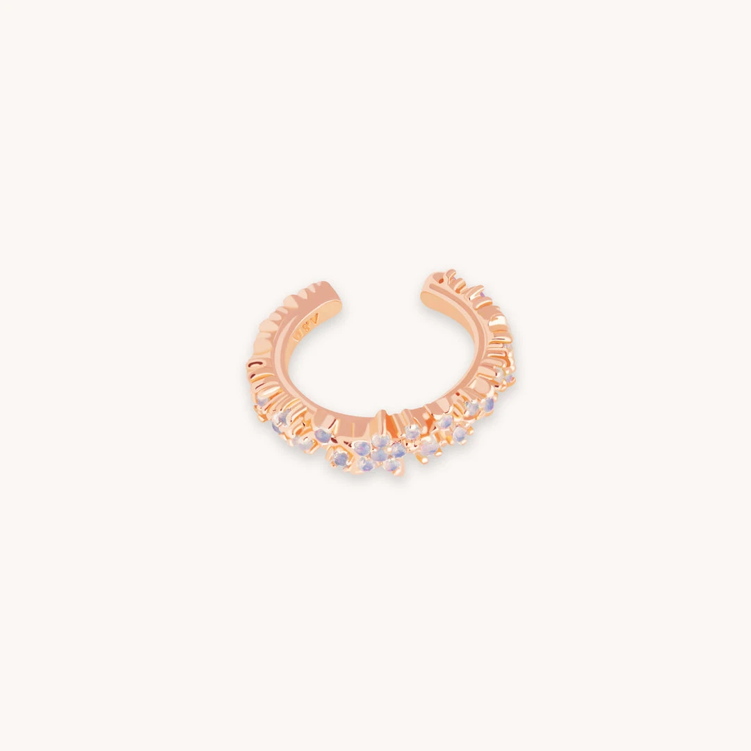 The mystic star cuff earrings are perfect for those looking for a statement celestial-theme ear stack. Adjustable and features an intricate starry opal design Pair with the mystic gem huggies in rose gold for a complete sparkling look.