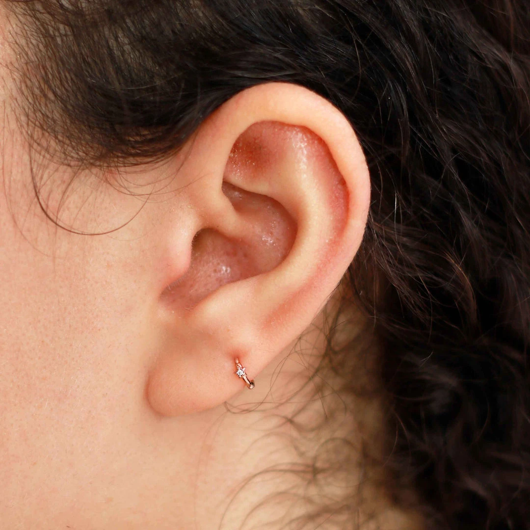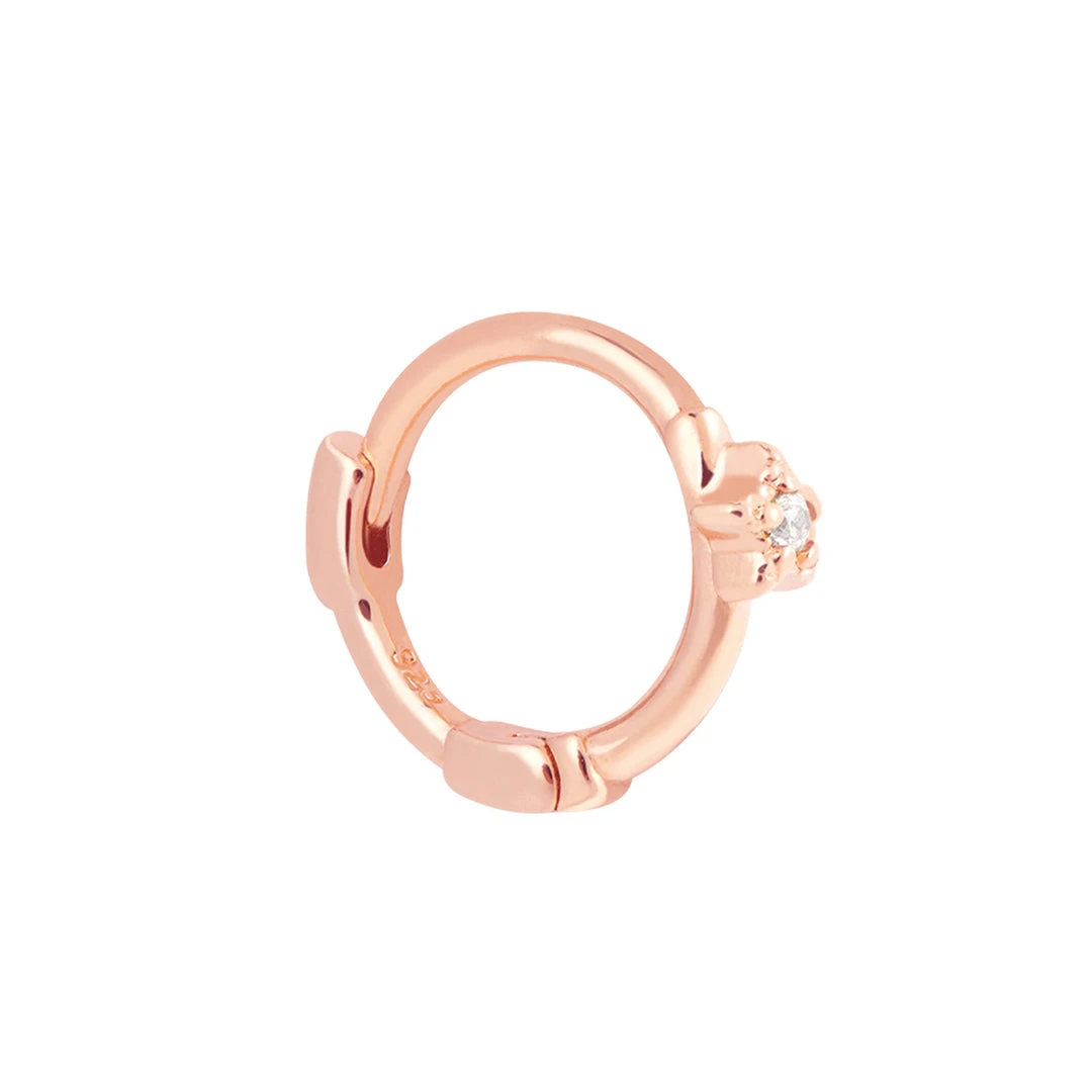 Simple and dainty with a hint of sparkle, the Gem Star Clicker in Rose Gold has the best of both worlds. Perfect to add to your ever growing collection and something that will never go our of style. Made from Sterling Silver and 18k Rose Gold plated. These hoops are teeny tiny so please check the measurements under details. *Please note – Earrings are non returnable due to hygiene reasons.