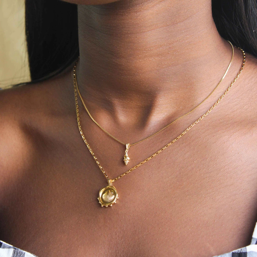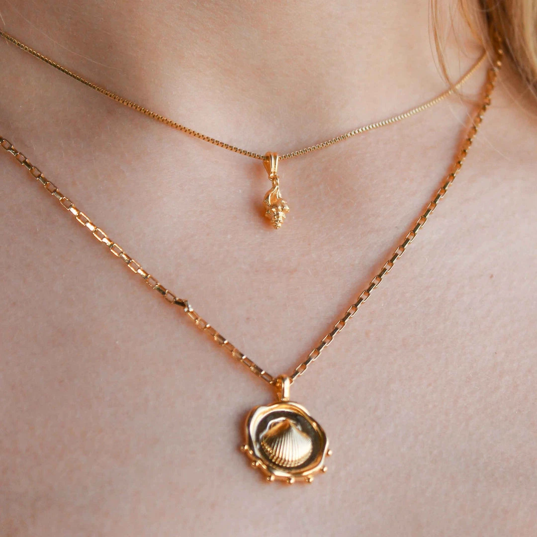 Give off serious mermaid vibes with the Whelk Shell Necklace Charm in Gold. Simply add to any of our necklace chains to add a beachy touch to your look.Â