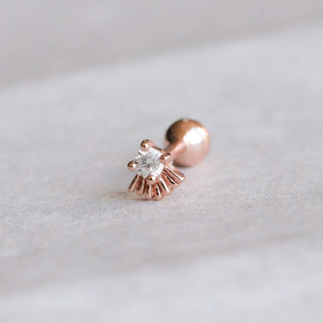 Beams of light to give us all hope ~ the Sunbeam Crystal Barbell in Rose Gold is a ray of sunshine in earring form. With a teeny cubic zirconia inlay, this sparkling barbell has a sunbeam design underneath, so your ear stack can shine like the sun. Wear this with our Radiant Textured Huggies and Baguette Crystal Ear Cuff for the full Aurora Collection glow.